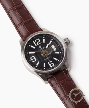 Eine Pilot-Uhr mit einem markanten 48.5mm Auftritt am Handgelenk, gefertigt aus Edelstahl mit einem Zifferblatt in schwarz und einer besonderen "matte with an open-heart (exposed balance) at center"-Oberfläche.