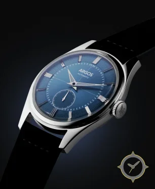 Eine Dress-Uhr mit einem markanten 44.5mm Auftritt am Handgelenk, gefertigt aus Edelstahl mit einem Zifferblatt in blau und einer besonderen "radial sunburst center with fluted/chapter-ring texture"-Oberfläche.
