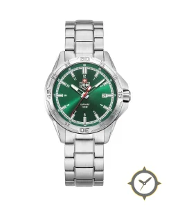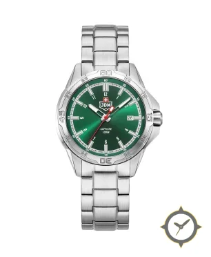 Eine Sport-Uhr mit einem markanten 49mm Auftritt am Handgelenk, gefertigt aus Edelstahl mit einem Zifferblatt in grün und einer besonderen "sunburst"-Oberfläche.