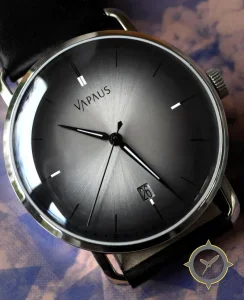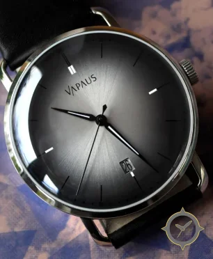 Eine Minimalistisch-Uhr mit einem markanten 44.5mm Auftritt am Handgelenk, gefertigt aus Edelstahl mit einem Zifferblatt in grau und einer besonderen "sunburst"-Oberfläche.