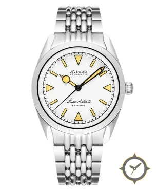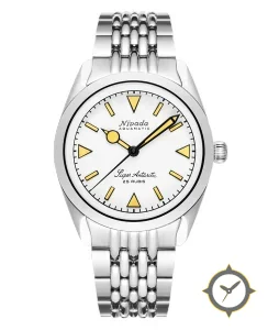 Eine Vintage-Uhr mit einem markanten 43.5mm Auftritt am Handgelenk, gefertigt aus Edelstahl mit einem Zifferblatt in weiß und einer besonderen "smooth lacquer"-Oberfläche.