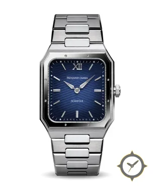 Eine Luxus-Uhr mit einem markanten 43.5mm Auftritt am Handgelenk, gefertigt aus Edelstahl mit einem Zifferblatt in blau und einer besonderen "guilloche wave / sunray texture"-Oberfläche.