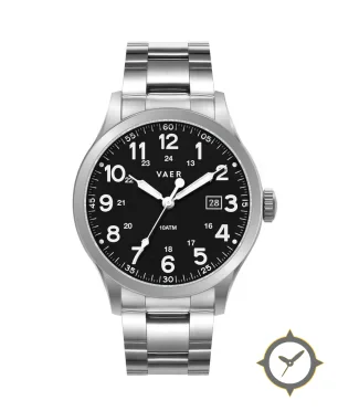 Eine Field-Uhr mit einem markanten 47mm Auftritt am Handgelenk, gefertigt aus Edelstahl mit einem Zifferblatt in schwarz und einer besonderen "matte"-Oberfläche.