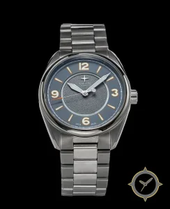 Eine Field-Uhr mit einem markanten 46.5mm Auftritt am Handgelenk, gefertigt aus Edelstahl mit einem Zifferblatt in blau und einer besonderen "textured, grained central disk with smoother outer chapter ring"-Oberfläche.