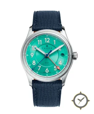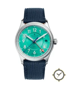 Eine -Uhr mit einem 36.5mm Gehäuse im Vintage-Stil gefertigt aus Edelstahl mit einem Zifferblatt in türkis und einer besonderen "sunburst"-Oberfläche.
