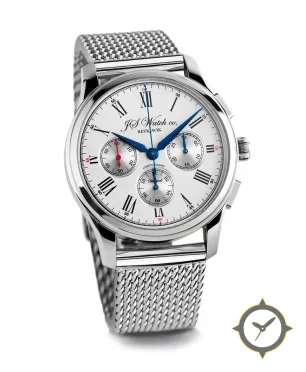 Eine Chronograph-Uhr mit einem markanten 47.5mm Auftritt am Handgelenk, gefertigt aus Edelstahl mit einem Zifferblatt in weiß und einer besonderen "lacquer"-Oberfläche.