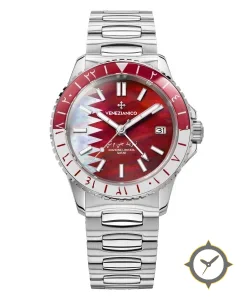 Eine GMT-Uhr mit einem 33mm Gehäuse im Vintage-Stil gefertigt aus Edelstahl mit einem Zifferblatt in rot und einer besonderen "mother-of-pearl (iridescent)"-Oberfläche und einer echten GMT-Funktion, mit der du eine zweite Zeitzone verfolgen kannst.