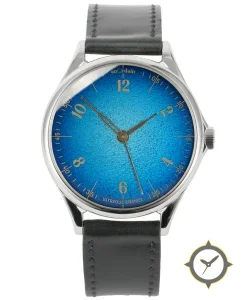 Eine Dress-Uhr mit einem vielseitigen 39.5mm Gehäuse, das an fast jedes Handgelenk passt, gefertigt aus Edelstahl mit einem Zifferblatt in blau und einer besonderen "grained vitreous enamel (textured)"-Oberfläche.