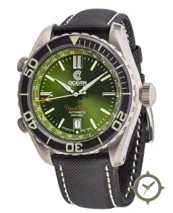 Eine Taucheruhr-Uhr mit einem markanten 48.5mm Auftritt am Handgelenk, gefertigt aus Edelstahl mit einem Zifferblatt in grün und einer besonderen "sunburst"-Oberfläche.
