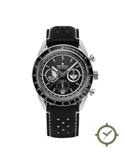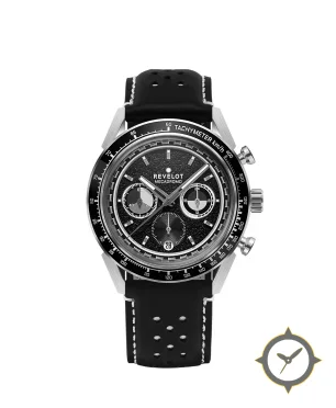 Eine Chronograph-Uhr mit einem markanten 45.5mm Auftritt am Handgelenk, gefertigt aus Edelstahl mit einem Zifferblatt in schwarz und einer besonderen "granular/speckled texture (meteorite-like)"-Oberfläche.