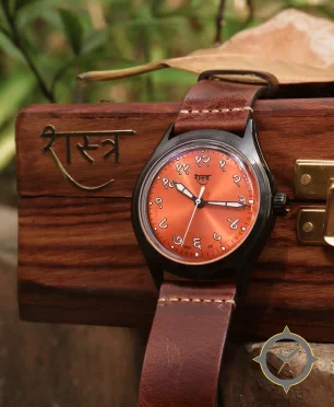 Eine Field-Uhr mit einem 34.5mm Gehäuse im Vintage-Stil gefertigt aus Edelstahl mit einem Zifferblatt in orange und einer besonderen "sunburst"-Oberfläche.