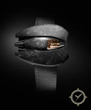 Eine Fahrer-Uhr mit einem markanten 46.5mm Auftritt am Handgelenk, gefertigt aus Carbon mit einem Zifferblatt in braun und einer besonderen "metallic"-Oberfläche.