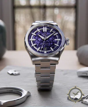 Eine Sport-Uhr mit einem 36.5mm Gehäuse im Vintage-Stil gefertigt aus Edelstahl mit einem Zifferblatt in lila und einer besonderen "textured, stone/meteorite-like finish"-Oberfläche.
