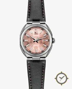 Eine Luxus-Uhr mit einem markanten 44mm Auftritt am Handgelenk, gefertigt aus Edelstahl mit einem Zifferblatt in karmesinrot und einer besonderen "sunburst / guilloché radial texture with starburst motif"-Oberfläche.