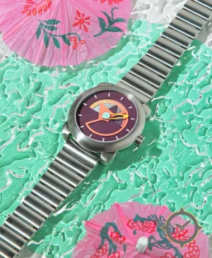 Eine Minimalistisch-Uhr mit einem markanten 45mm Auftritt am Handgelenk, gefertigt aus Edelstahl mit einem Zifferblatt in lila und einer besonderen "matte"-Oberfläche.
