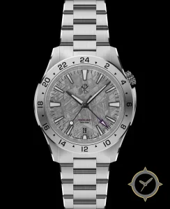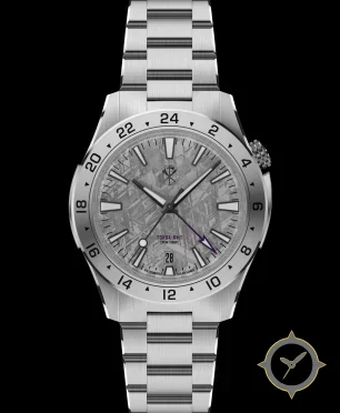 Eine Sport-Uhr mit einem 32mm Gehäuse im Vintage-Stil gefertigt aus Edelstahl mit einem Zifferblatt in grau und einer besonderen "meteorite (Widmanstätten)"-Oberfläche.