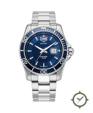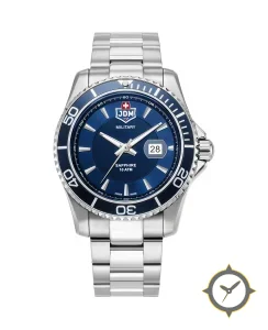 Eine Taucheruhr-Uhr mit einem markanten 51mm Auftritt am Handgelenk, gefertigt aus Edelstahl mit einem Zifferblatt in blau und einer besonderen "sunburst"-Oberfläche.