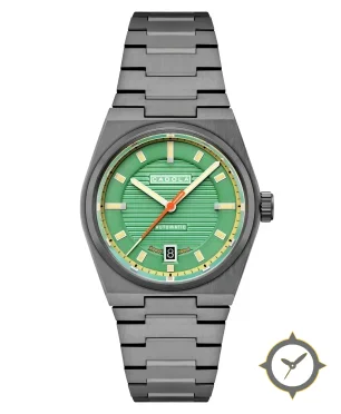 Eine Sport-Uhr mit einem vielseitigen 40.5mm Gehäuse, das an fast jedes Handgelenk passt, gefertigt aus Edelstahl mit einem Zifferblatt in grün und einer besonderen "horizontal ribbed (teak-style)"-Oberfläche.