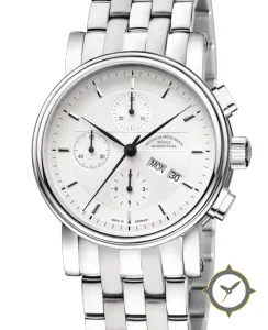 Eine Chronograph-Uhr mit einem markanten 46mm Auftritt am Handgelenk, gefertigt aus Edelstahl mit einem Zifferblatt in weiß und einer besonderen "concentric guilloché (circular engraving)"-Oberfläche.