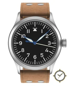 Eine Pilot-Uhr mit einem 36mm Gehäuse im Vintage-Stil gefertigt aus Edelstahl mit einem Zifferblatt in schwarz und einer besonderen "matte"-Oberfläche.