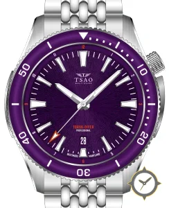 Eine Taucheruhr-Uhr mit einem markanten 43mm Auftritt am Handgelenk, gefertigt aus Edelstahl mit einem Zifferblatt in lila und einer besonderen "sunburst"-Oberfläche.