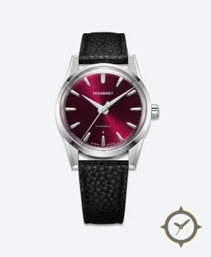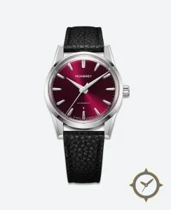 Eine Dress-Uhr mit einem markanten 42mm Auftritt am Handgelenk, gefertigt aus Edelstahl mit einem Zifferblatt in karmesinrot und einer besonderen "sunburst"-Oberfläche.