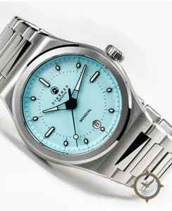 Eine Sport-Uhr mit einem markanten 43.5mm Auftritt am Handgelenk, gefertigt aus Edelstahl mit einem Zifferblatt in türkis und einer besonderen "lacquer"-Oberfläche.