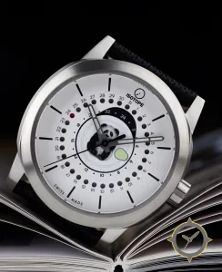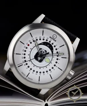 Eine Minimalistisch-Uhr mit einem markanten 44mm Auftritt am Handgelenk, gefertigt aus Edelstahl mit einem Zifferblatt in weiß und einer besonderen "smooth matte"-Oberfläche.