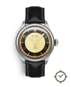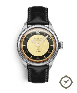 Eine Vintage-Uhr mit einem markanten 42mm Auftritt am Handgelenk, gefertigt aus Edelstahl mit einem Zifferblatt in gold und einer besonderen "brushed (center) with smooth outer ring"-Oberfläche.