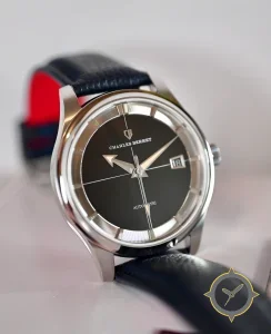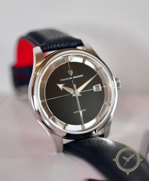 Eine Dress-Uhr mit einem markanten 44mm Auftritt am Handgelenk, gefertigt aus Edelstahl mit einem Zifferblatt in schwarz und einer besonderen "matte"-Oberfläche.