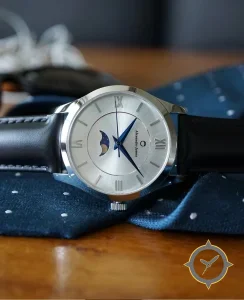 Eine Dress-Uhr mit einem markanten 42mm Auftritt am Handgelenk, gefertigt aus Edelstahl mit einem Zifferblatt in silber und einer besonderen "sunburst/brushed"-Oberfläche und einer wunderschönen Mondphasenanzeige.
