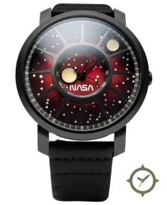 Eine Luftfahrt-Uhr mit einem markanten 52.5mm Auftritt am Handgelenk, gefertigt aus Edelstahl mit einem Zifferblatt in rot und einer besonderen "gradient sunburst with starry speckle"-Oberfläche und einer wunderschönen Mondphasenanzeige.
