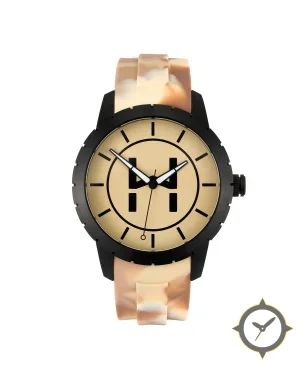 Eine Minimalistisch-Uhr mit einem markanten 51.5mm Auftritt am Handgelenk, gefertigt aus Edelstahl mit einem Zifferblatt in braun und einer besonderen "matte"-Oberfläche.