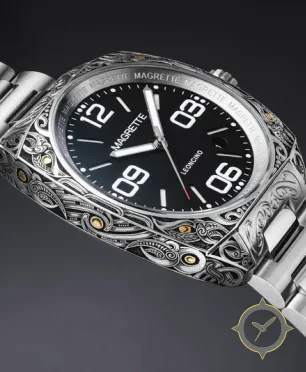 Eine Luxus-Uhr mit einem 34mm Gehäuse im Vintage-Stil gefertigt aus Edelstahl mit einem Zifferblatt in schwarz und einer besonderen "glossy lacquer"-Oberfläche.