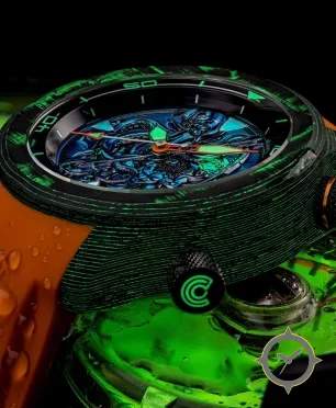 Eine Taucheruhr-Uhr mit einem markanten 46.5mm Auftritt am Handgelenk, gefertigt aus Carbon mit einem Zifferblatt in blau und einer besonderen "high-relief engraved/sculpted dial with multi-layer coloration and luminescent accents"-Oberfläche.