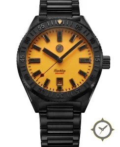 Eine Taucheruhr-Uhr mit einem 34.5mm Gehäuse im Vintage-Stil gefertigt aus Edelstahl mit einem Zifferblatt in orange und einer besonderen "matte"-Oberfläche.