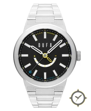 Eine Sport-Uhr mit einem vielseitigen 39.5mm Gehäuse, das an fast jedes Handgelenk passt, gefertigt aus Edelstahl mit einem Zifferblatt in schwarz und einer besonderen "matte"-Oberfläche und einer praktischen Gangreserveanzeige.