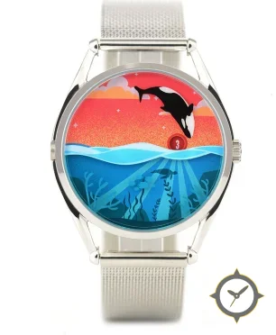 Eine Nautisch-Uhr mit einem markanten 41.5mm Auftritt am Handgelenk, gefertigt aus Edelstahl mit einem Zifferblatt in blau und einer besonderen "printed illustration with matte and metallic gradient areas"-Oberfläche.