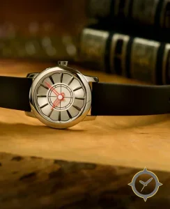 Eine Minimalistisch-Uhr mit einem 36mm Gehäuse im Vintage-Stil gefertigt aus Edelstahl mit einem Zifferblatt in silber und einer besonderen "brushed radial segments / sunburst"-Oberfläche.