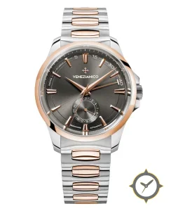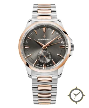 Eine Luxus-Uhr mit einem markanten 44.5mm Auftritt am Handgelenk, gefertigt aus Edelstahl mit einem Zifferblatt in grau und einer besonderen "sunburst"-Oberfläche und einer praktischen Gangreserveanzeige.