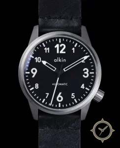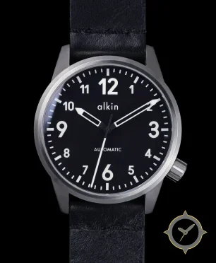 Eine Pilot-Uhr mit einem 36mm Gehäuse im Vintage-Stil gefertigt aus Edelstahl mit einem Zifferblatt in schwarz und einer besonderen "matte"-Oberfläche.
