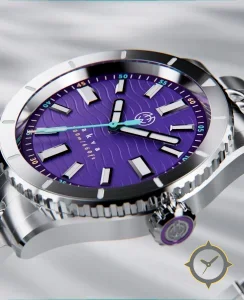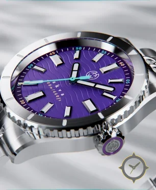 Eine Taucheruhr-Uhr mit einem 36.5mm Gehäuse im Vintage-Stil gefertigt aus Edelstahl mit einem Zifferblatt in lila und einer besonderen "wavy embossed texture (wave motif)"-Oberfläche.