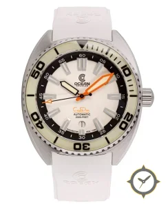 Eine Taucheruhr-Uhr mit einem vielseitigen 41mm Gehäuse, das an fast jedes Handgelenk passt, gefertigt aus Edelstahl mit einem Zifferblatt in weiß und einer besonderen "matte"-Oberfläche.