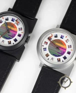 Eine Minimalistisch-Uhr mit einem markanten 45mm Auftritt am Handgelenk, gefertigt aus Edelstahl mit einem Zifferblatt in weiß und einer besonderen "matte with a multicolored printed center disk"-Oberfläche.