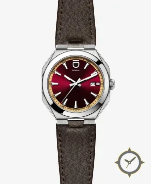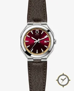 Eine Luxus-Uhr mit einem markanten 42.5mm Auftritt am Handgelenk, gefertigt aus Edelstahl mit einem Zifferblatt in karmesinrot und einer besonderen "sunburst"-Oberfläche.