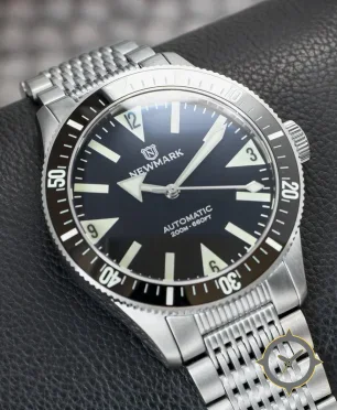 Eine Taucheruhr-Uhr mit einem markanten 41.5mm Auftritt am Handgelenk, gefertigt aus Edelstahl mit einem Zifferblatt in schwarz und einer besonderen "glossy"-Oberfläche.