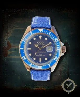 Eine Taucheruhr-Uhr mit einem 35.5mm Gehäuse im Vintage-Stil gefertigt aus Bronze mit einem Zifferblatt in blau und einer besonderen "matte"-Oberfläche.