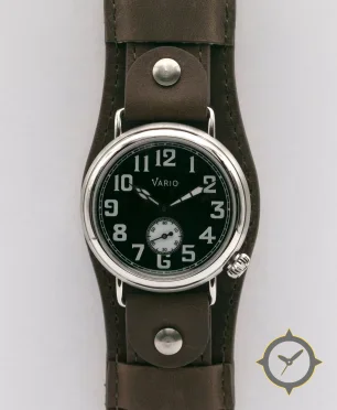 Eine Vintage-Uhr mit einem 30.5mm Gehäuse im Vintage-Stil gefertigt aus Edelstahl mit einem Zifferblatt in schwarz und einer besonderen "matte"-Oberfläche.