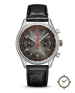 Eine Chronograph-Uhr mit einem 37mm Gehäuse im Vintage-Stil gefertigt aus Edelstahl mit einem Zifferblatt in grau und einer besonderen "fumé sunburst (gradient)"-Oberfläche.