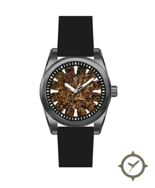 Eine Field-Uhr mit einem vielseitigen 39mm Gehäuse, das an fast jedes Handgelenk passt, gefertigt aus Edelstahl mit einem Zifferblatt in braun und einer besonderen "textured/granular (stone-like)"-Oberfläche.